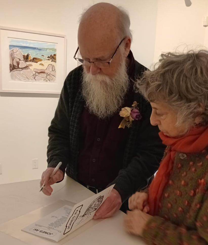 Barry and Mary co-sign Jones Av XVI/4 2014 for deposit in the Hodgson archive at Ingram Gallery. On the wall behind — Coote Cove, Crystal Crescent Beach (2024) 16 x 20 pastel on paper. Photograph by Barbara Cantwell Hodgson.