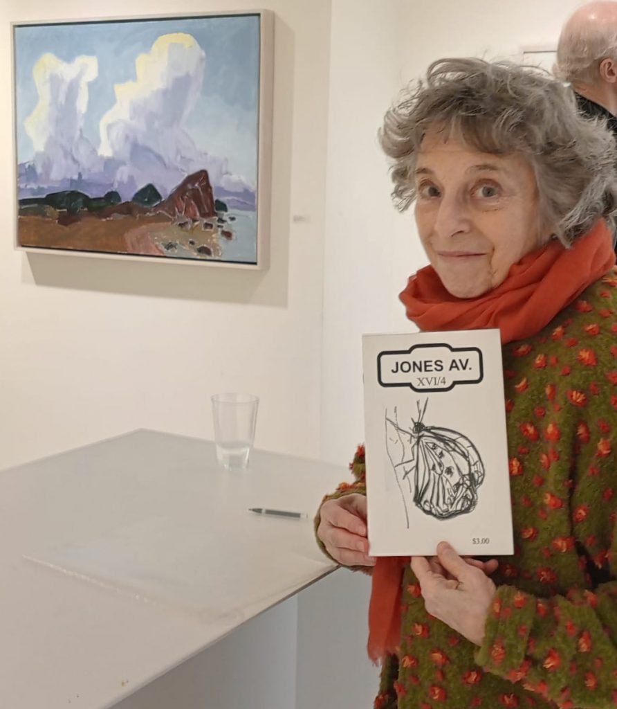 Jones Av XVI/4 2014 — butterfly cover image by Barry Hodgson; inside, more butterflies by Barry and a poem by me. On the wall behind — Sunrise, Mandalika Beach (2025) 30×40 oil on panel. Photograph by Barbara Cantwell Hodgson.